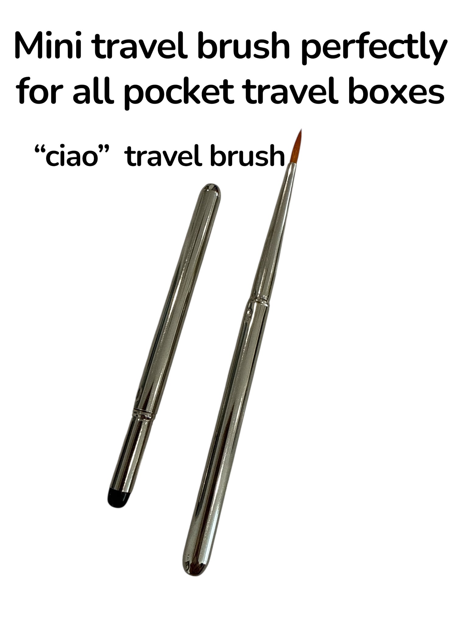 The lid opens to allow the open area to be used for mixing colors. The ringer ring on the bottom allows you to grip the palette when on the go or sitting at a lounge painting. Custom Black Velvet Storage case included and our famous travel brush too! This one is TSA approved.
