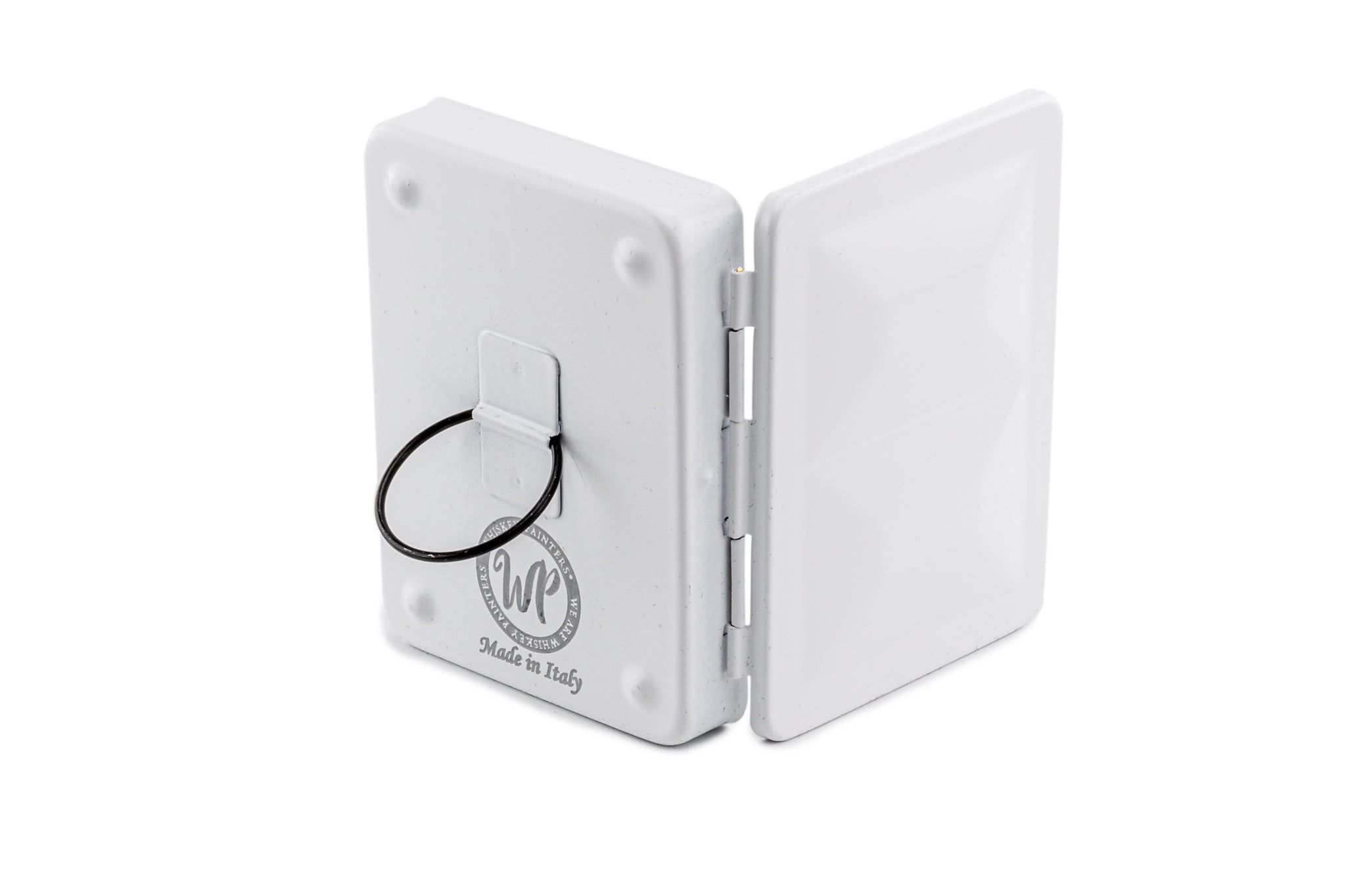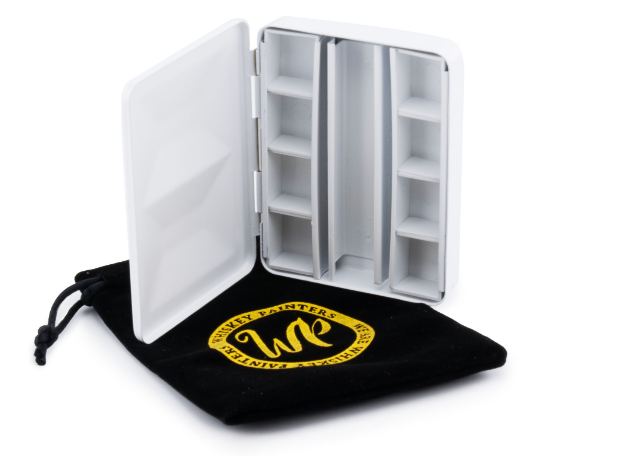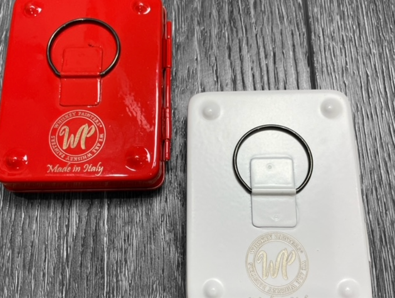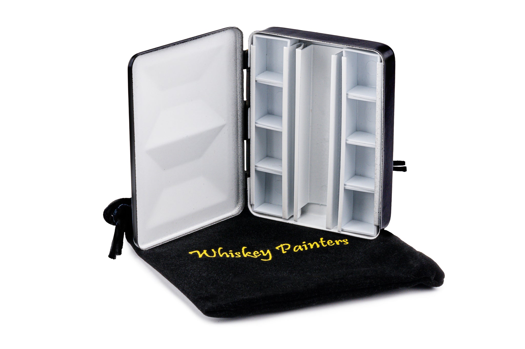 This classic mighty mini palette is what every artist needs. This palette fits into any pocket and fits into any size hand. Whether you are on a plane traveling to Italy, wearing a suit, or off to the park: it can fit into any pocket, purse or travel bag. The best travel palette out there. The ring on the bottom allows it to stay secure when holding it in your palm. The lid when open makes a handy mixing area and our Whiskey Painters brush easily fits down the center for storage.